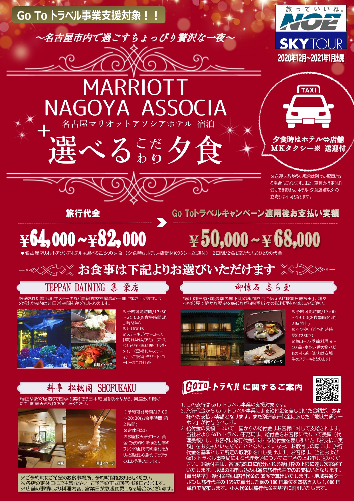 今回特別企画として ホテル⇔食事場所は タクシー をつけた商品となっております。アルコールを飲まれる方もございません。